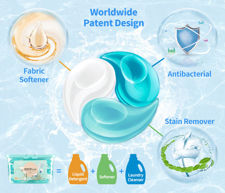 OUAINI Spring Dew Laundry Capsules with concentrated bio enzymes effectively removing and preventing the musty odor of the rainy season. With the fresh herbal scent style keeping you in a much freshen atmosphere. Eco friendly laundry detergent capsules, factory direct sale, customized and private label for own brand.